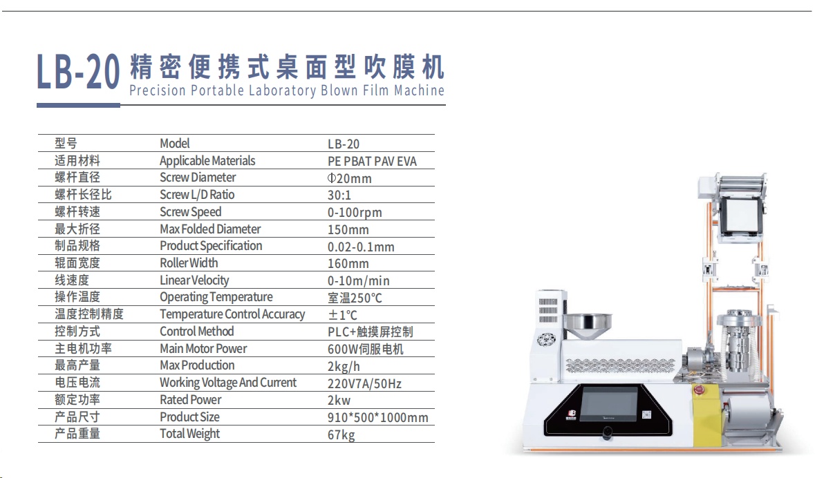 精密便携式桌面型吹膜机LB-20是一款专为实验室研发设计的高性能桌面型吹膜设备,集精密控制与便携性于一体。该设备采用φ20mm精密螺杆,30:1的优化长径比设计,配合0-100rpm无级调速功能,可处理PE、PBAT、PAV、EVA等多种高分子材料。