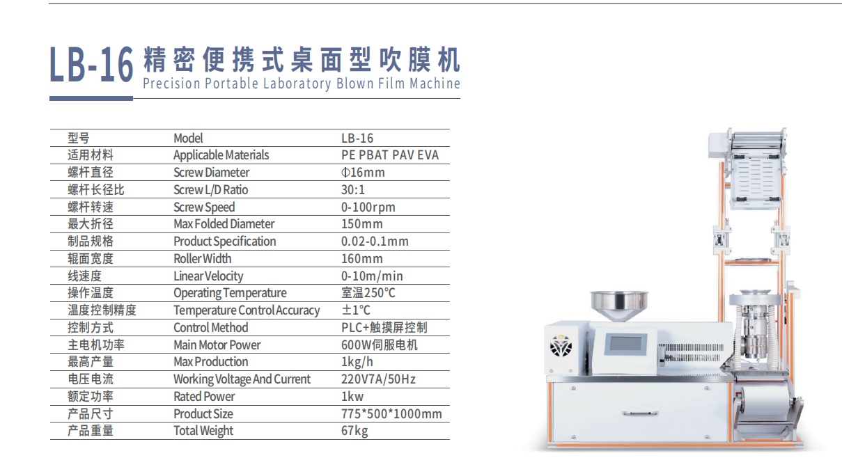 精密便携式桌面型吹膜机LB-16是一款专为实验室研发设计的紧凑型吹膜设备,具有出色的便携性和精确控制性能。该设备采用φ16mm精密螺杆,长径比达30:1,转速0-100rpm无级可调,可处理PE、PBAT、PAV、EVA等多种高分子材料。