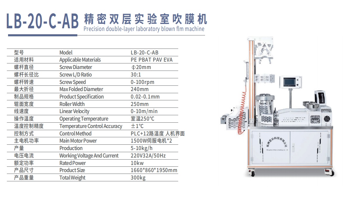 LB-20-C-AB采用10kW额定功率设计,1660×860×1950mm的紧凑结构,整机重量300kg。该设备特别适合功能性复合薄膜的研发、工艺验证和小批量生产,是科研院所、高校实验室和企业研发中心进行新材料开发、产品升级的理想平台,为多层复合薄膜的研发提供全面的技术支持。